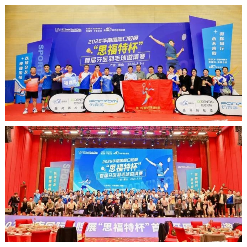 大会启幕前夕,一场活力满满的预热活动率先上演。3月1日至2日,“思福特杯”首届牙医羽毛球邀请赛在广东佛山顺利举办,来自全国各省的数十支队伍、100余名牙医健儿齐聚一堂,以球会友、共展风采。福建省民营口腔代表团由主委曾杰生副主委王炳贤、王斌及张翼主任带队,陈桢、郑志强、杨翼明、杨至、徐珊珊、邱梦娇、吕雪莲、曾昱炀8位运动健儿出征参赛。赛场上,福建口腔联队的队员们默契配合、奋勇拼搏,凭借出色的竞技状态和坚韧的体育精神,在众多强队中脱颖而出,最终斩获此次全国“思福特杯”团体赛亚军,用活力与激情展现了闽牙人的别样风采!此次赛事圆满落幕,也为代表团赴华南口腔展的行程拉开了精彩序幕